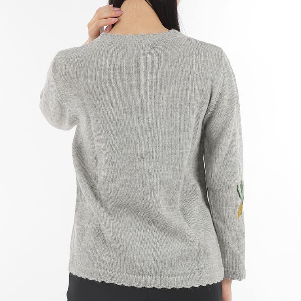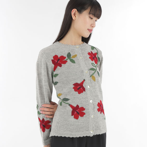 アルパカ毛100%の高品質素材を使用したフラワーモチーフカーディガン。その原毛は軽く、滑らかな手触りに加え、優れた保温性を誇ります。インターシャ編みで表現された繊細な花柄と、蔓(つる)の刺しゅうが美しい一着。スカラップ模様の縁編みや貝ボタンの細部までこだわったデザインが、着る人の魅力を引き立てます。秋冬の装いにふさわしい贅沢なアイテムです。