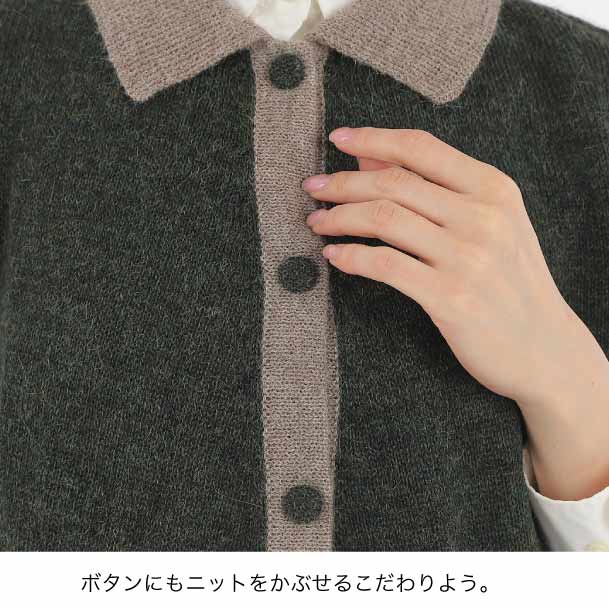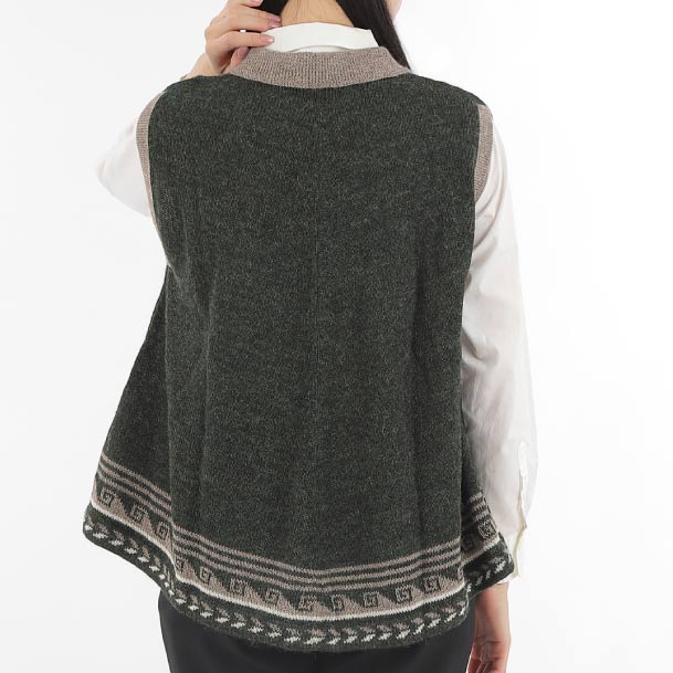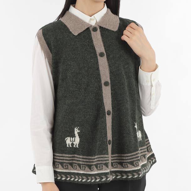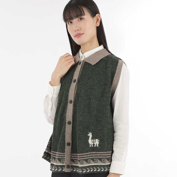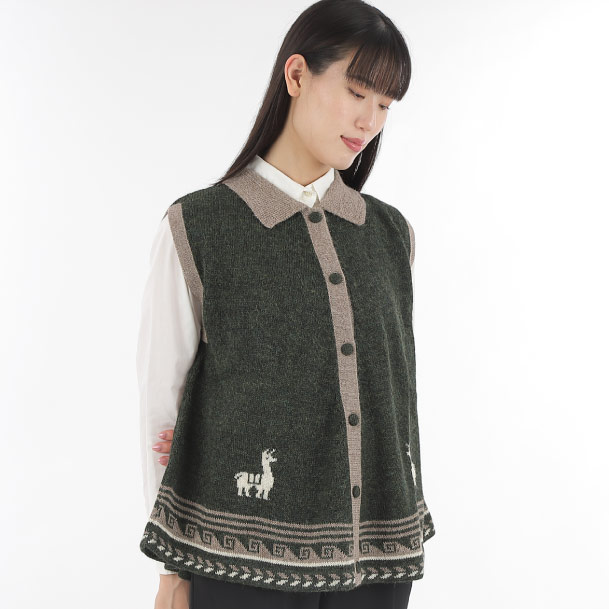 ふんわり軽い着心地が魅力の襟付きフレアベスト。アルパカ100%の素材を使用し、繊細な編み模様とメランジ調グリーンの色合いが、自然の優雅さを引き立てます。腰まで覆う少し長めの丈が、すっきりとしたスタイルを演出しながら体形をさりげなくカバー。寒い季節も暖かさをキープしつつ、どんな装いにも品格を添える特別なアイテムです。