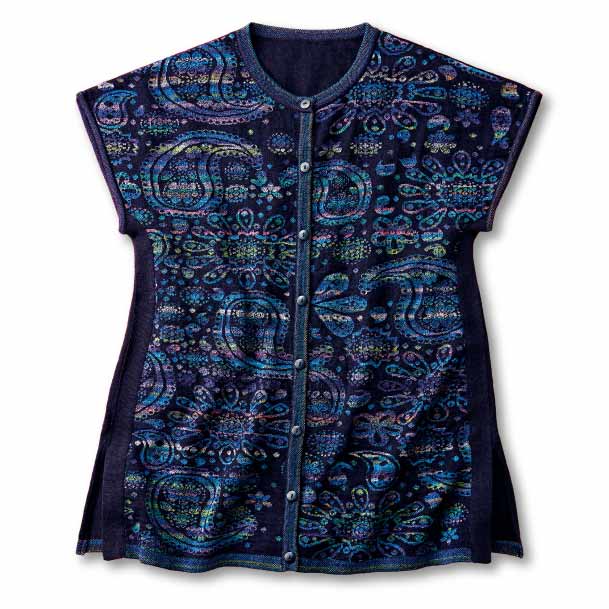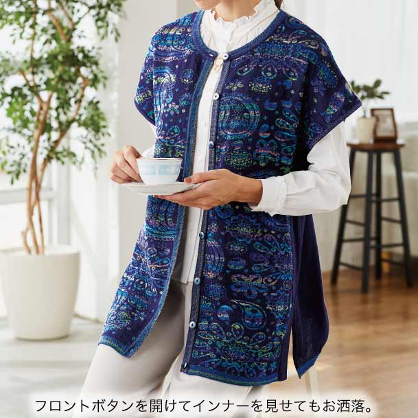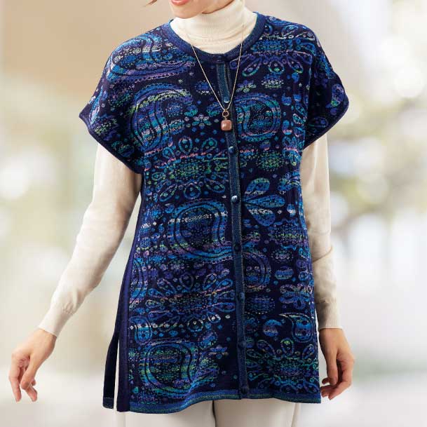 アンデスの宝石と称される希少なベビーアルパカと12色に染め上げた絣糸が織りなすのはラメの輝きも見事な社交界の華、ペイズリー文様――。鮮やかに浮かび上がる美しい色彩と、ふんわり優しい温もりが冬の貴女を抱擁するエレガントなロングジレ。世界が称賛する「五泉ニット」の技と感性が光る逸品です。