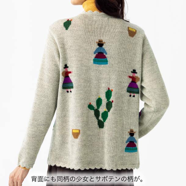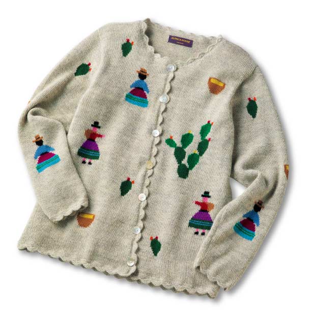 アンデスの少女とサボテンの牧歌的な柄に愛らしいスカラップ編みを添えました。ボタンはシェルボタン、クラフト感あふれる手の込んだ作りのカーディガン。