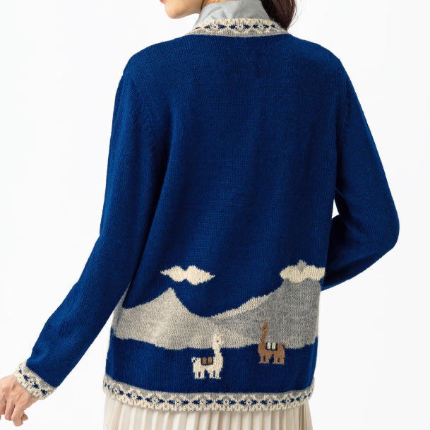 山脈が雲を抱いて360度連なる風景柄がアンデスの広大さを感じさせます。同色の幾何柄でトリミングし、木調のボタンで全体をまとめました。絵画的なデザイン性が魅力の一着です。