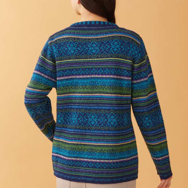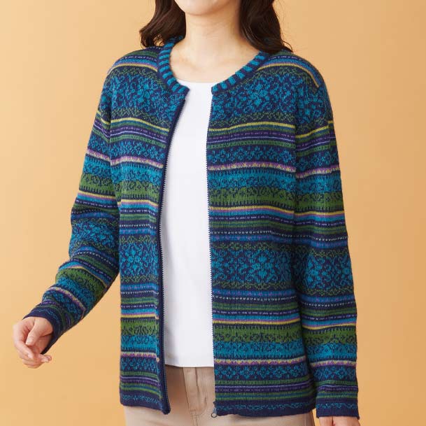 ウールに勝る耐久性とカシミヤをも凌ぐといわれる保温性が魅力のアルパカ。海抜4~5千mの高地に生息するアルパカの貴重な原毛を、軽快なジップ仕様のカーディガンに編み上げました。脱ぎ着がラクでボトムスに合わせやすいシルエット。鮮やかなペルー伝統の幾何学模様が目を惹きます。