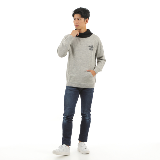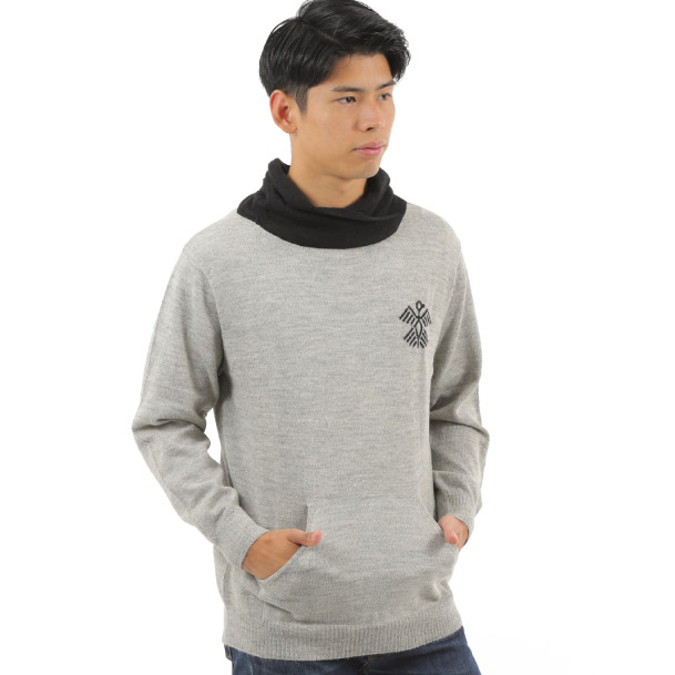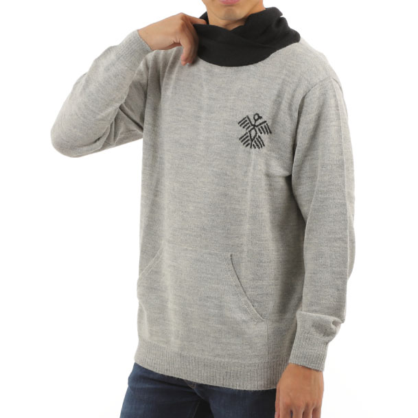 このセーターは胸にナスカの地上絵をモチーフにしたワンポイント柄があり、オシャレな印象を与えます。また、首周りがオフタートル仕様になっており防寒性もバッチリです。さらに、前身頃にはマフポケットも付いており、カジュアルなデザインも魅力的です。