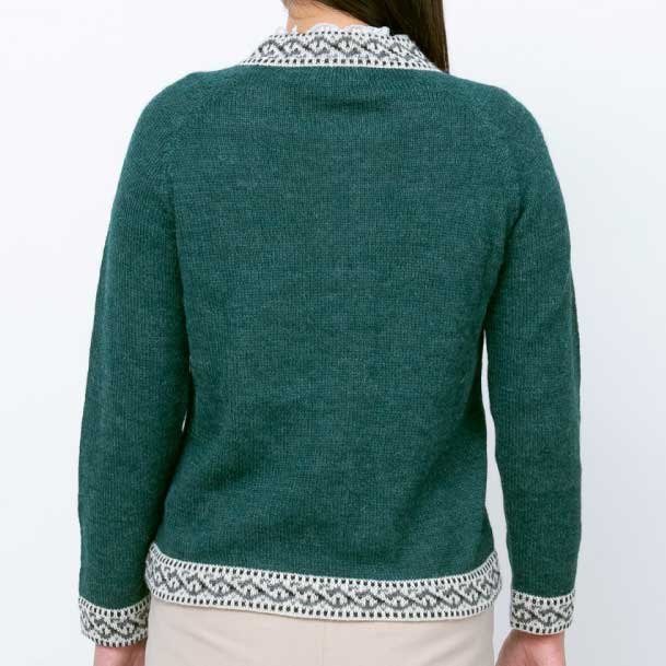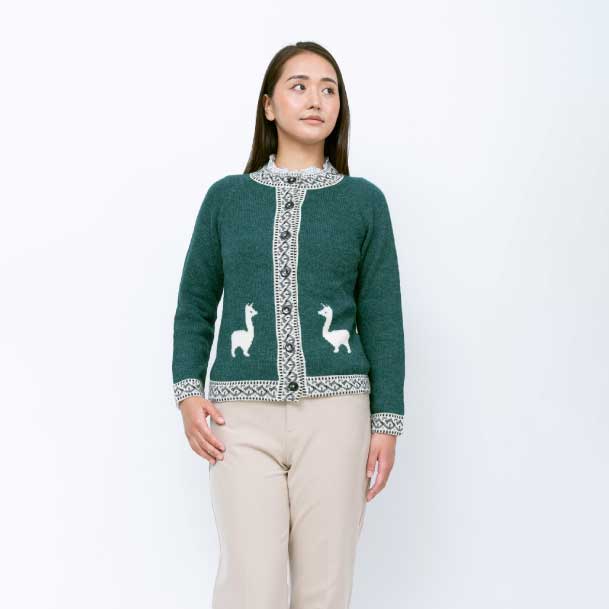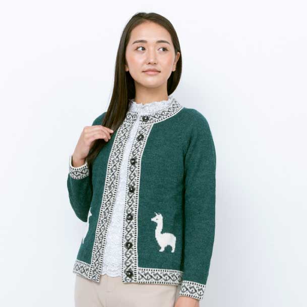 美しい深みのあるグリーンが映えるこちらのカーディガンは、シンプルなスタイリングをすることで大人かわいい雰囲気に包まれます。襟や裾、前開き部分にホワイトとグレー系のトリミングを行うことで、全体的なバランスも整いました。向かい合う2頭のアルパカは、適度な抜け感を演出。素材には抜群の温もりとやわらかな質感で欧米のトレンド素材になっているペルー産アルパカを100%使用しました。ラグラン形状なので、華奢に見せる視覚効果も。お洒落だけでなく、極上の手触りと幸せな温もりに包まれる贅沢を体感してください。