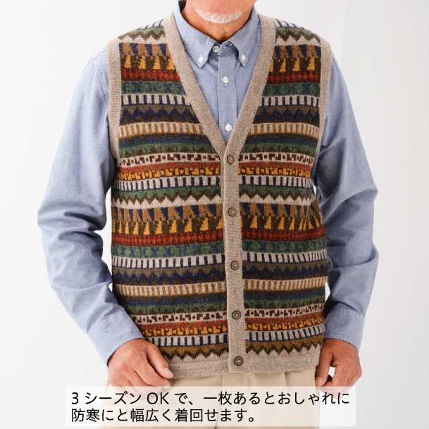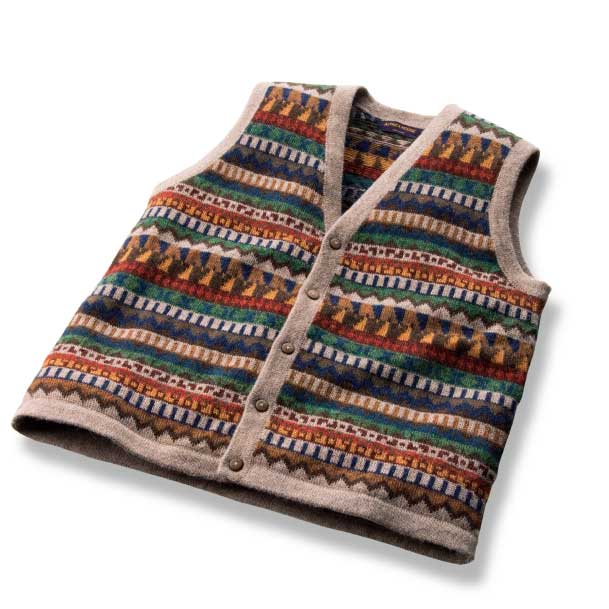 アルパカの原毛は、軽く滑らかで羊毛に勝る耐久性を持ち、保温性はカシミヤさえしのぐほどですが、収穫量が限られるためとても貴重です。そのアルパカを100%使用した贅沢なベスト。軽いから着心地快適、上質な温かさが体を包み込みます。ペルー伝統の編み柄をボーダー状に仕上げたデザインは多色使いながらも大人の装いにふさわしい落ち着いた雰囲気。春先まで長く着られて重宝します。