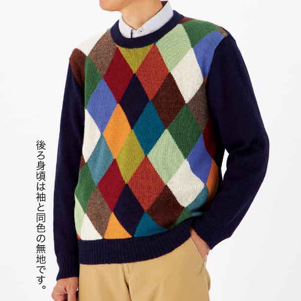 シルクのような光沢と滑らかさ、カシミヤ以上とも言われる暖かさを誇るアルパカの原毛を贅沢に用いたセーターです。前身頃はトラッドなダイヤ柄を多色使いで編み上げました。コーディネートを印象的に仕上げてくれるデザインが、明るく彩ってくれます。