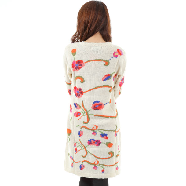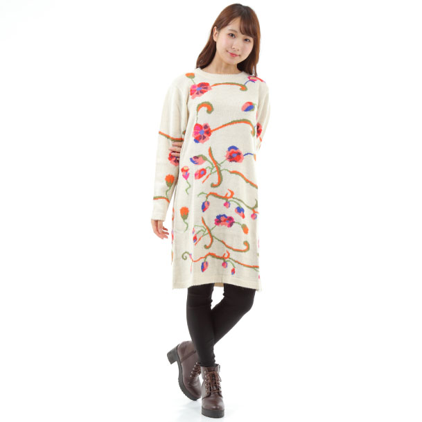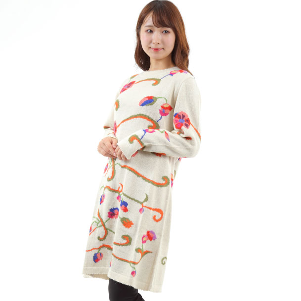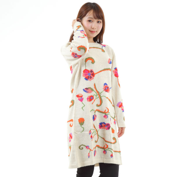 寒い季節も快適に過ごせるアルパカ100%のニットワンピースです。海抜4,000~5,000mという高地の厳しい自然環境の下に生息するアルパカは数が少なく、その原毛は年間の収穫量が限られるため大変貴重なものです。しかも耐久性に強く毛玉になりにくいので、普通のお手入れをするだけで何十年と着続けることも可能です。こちらのワンピースは、つる科の美しい花を全体に施したエレガントなデザインが特徴で、ナチュラルに華やかさと可愛さをプラスしてくれます。